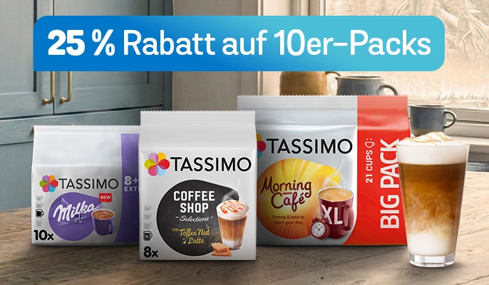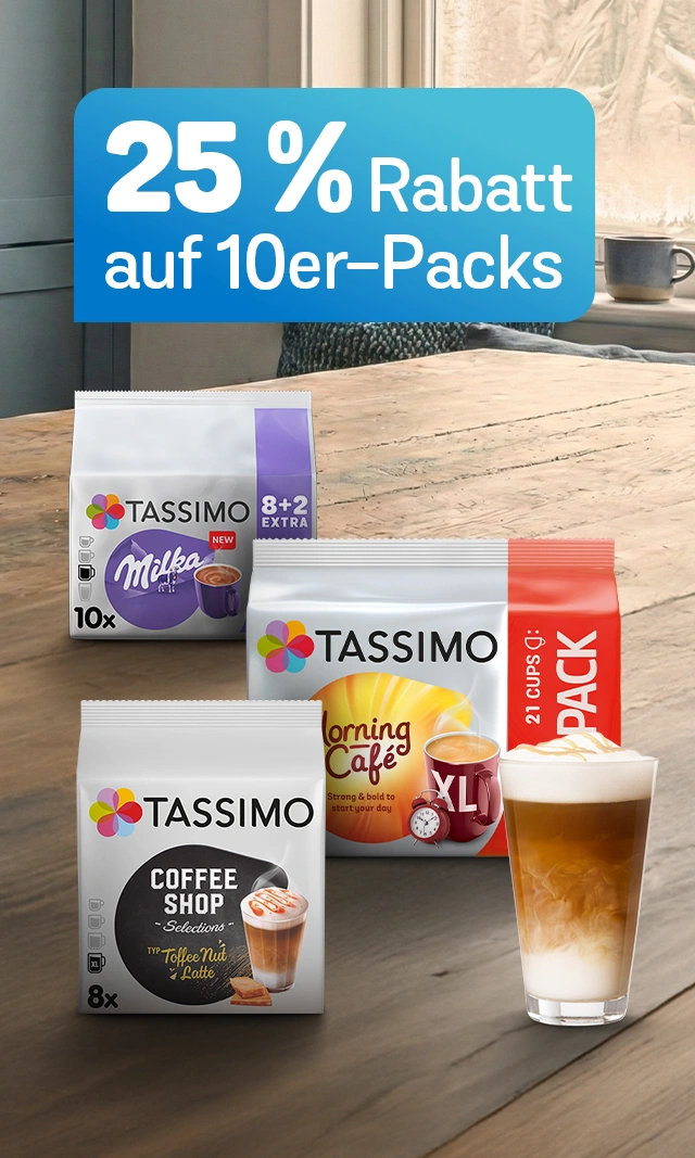 TASSIMO bietet dir die größte Auswahl an TASSIMO-Kapseln zu den besten Preisen. Du kannst Kaffeekapseln für verschiedene Kaffeesorten, Geschmacksrichtungen und von verschiedenen Marken bestellen - von Costa Kaffeekapseln bis hin zu Cadbury Hot Chocolate T DISCs. Alle TASSIMO Kapseln für Heißgetränke sind mit jeder Bosch TASSIMO Maschine kompatibel. Brauchst du etwas Beratung? Sieh dir unsere meistverkauften Kapseln an oder lies unseren T DISCs-Guide, in dem das gesamte Sortiment der Kapseln und ihre Geschmacksrichtungen beschrieben werden. Probiere alle unsere T DISCs aus und finde deine Lieblingskapseln und deine Kaffeemaschine von TASSIMO.
