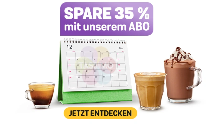 Möchtest du am meisten sparen? Schliesse ein TASSIMO Abo ab und erhalte 35% Rabatt. Du kannst es jederzeit ändern, pausieren oder ohne Aufwand kündigen.