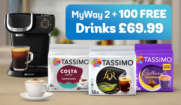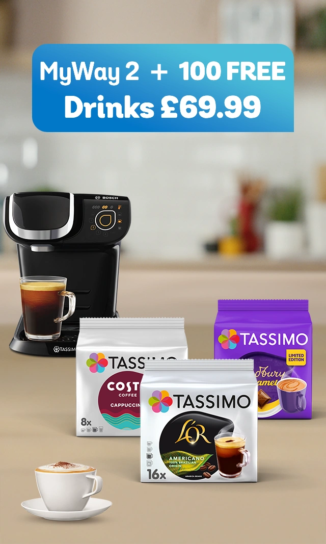 The TASSIMO My Way Coffee Machine uses the Intellibrew technology to read the barcode on the T DISC you insert and then prepares the perfect drink. You can then make personal settings such as intensity, temperature, and cup size via the Sensor Touch control panel. The machine will save your settings for up to four drinks. The shelf height is variable so that even larger glasses, for example for your latte, can fit under the spout. Looking for first use instructions or troubleshooting? Have a look at TASSIMO Maintenance & Manuals. Or discover how to descale your TASSIMO machine. The TASSIMO Bosch My Way and My Way 2 coffee machine is available online at TASSIMO. You can order the TASSIMO Bosch My Way online and we will deliver the coffee machine to your home.